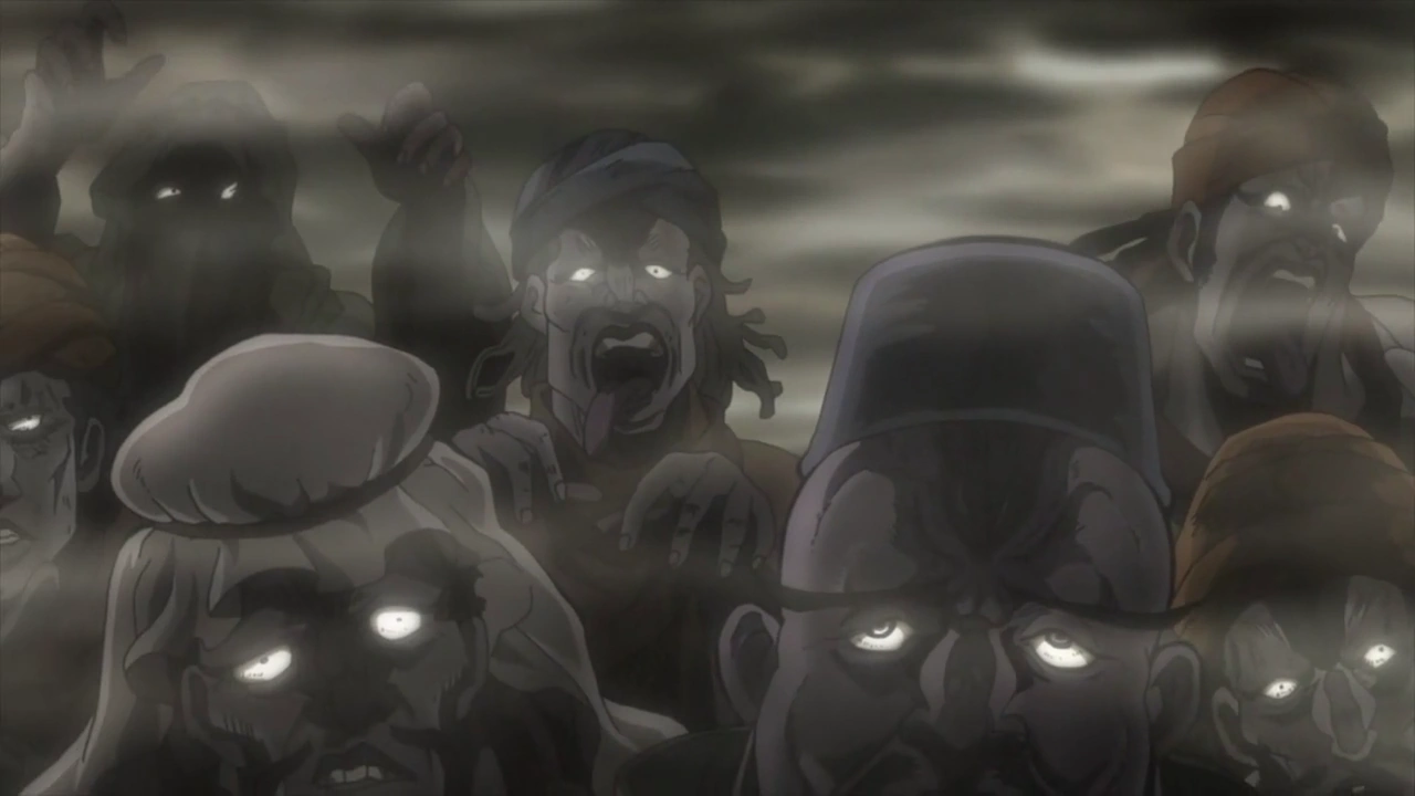 Sort alors de partout, l'armée de zombies d'Enya, qui est facilement repoussée par l'ORA ORA de Star Platinum, Jôtarô est malencontreusement touché à la jambe par un bébé zombie. Bien que sous l'emprise Justice, Jôtarô tente de l'attaquer, en vain.