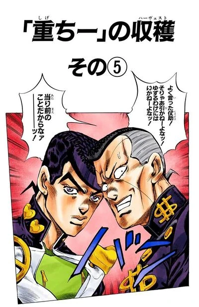 Irritados com a segunda tentativa de Shigechi de enganá-los, Josuke e Okuyasu o confrontam sobre os 5.000.000 ienes. Shigechi presunçosamente os oferece 20.000 ienes, considerando isso um ato de "simpatia". Isso enfurece Okuyasu, que soca Shigechi e pega o cheque de suas mãos. Okuyasu então insulta Shigechi, mas Josuke o para, dizendo que já basta e ambos partem, lamentando a mentalidade e atitude de Shigechi. Por sua vez, Shigechi fica furioso e envia Harvest atrás deles.