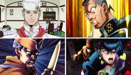 | Josuke Higashikata | Okuyasu Nijimura | Tonio Trussardi | Jotaro Kujo | Agente da Fundação Speedwagon |