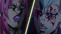 Confuso, ele percebe que Trish está revidando e que a Spice Girl usou sua habilidade para suavizar as balas. Diavolo revida desejando que sua filha nunca tivesse nascido, antes de furiosamente perfurar sua alma limpando o estômago. Ele então usa a força do soco para enviar o corpo de Mista voando na direção do Arrow que escapou dele. Tendo mais uma vez, Diavolo tenta perfurar King Crimson sem hesitação, apenas para a fase Arrow diretamente na mão do Stand; Bucciarati sacrifica sua própria vida finalmente destruindo os restos mortais de Chariot Requiem, salvando a vida de Trish desfazendo sua habilidade e rasgando a alma de Diavolo e King Crimson longe do Arrow.