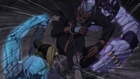 Bons sonhos, canalha! : Jolyne convoca Stone Free enquanto os dois chutam rapidamente em uníssono, o golpe final fazendo o oponente voar. (Comboable através de Puttsun Cancel)
