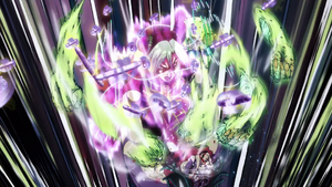 With Weather - O momento está do nosso lado! : Stone Free ataca o oponente enquanto o Stand do Weather Report cria um vendaval oposto que mantém o oponente no lugar. Os punhos de Stone Free finalmente dominam o vendaval e o alvo é enviado voando para o estande do Weather Report, incendiando-o por fricção.
