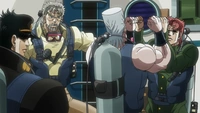 Joseph falando para Kakyoin e Polnareff pararem com suas brincadeiras.
