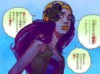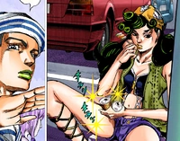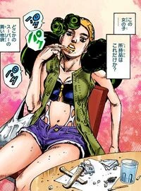 Mais tarde, ela e Josuke vão a um café no centro de Morioh , onde ela enfia vários itens em um saco plástico, antes de comer pão com açúcar e molho de soja, depois oferece a Josuke alegando que tem gosto de sukiyaki. Depois de limpar os espaços entre os dedos dos pés com um guardanapo embebido em água, ela entra no banheiro com um velho usando seu poder Stand para deixar o cabelo crescer na cabeça que é interrompido por Josuke, que erroneamente pensou que ela estava se prostituindo. Mais tarde, ela explica a Josuke que é paga deixando crescer cabelo na cabeça dos homens (enquanto eles estão no raio de seu Stand), e responde ao interrogatório de Josuke sobre ela que ela o ama, não se importando com sua família e que ela vive no presente. . Imediatamente depois disso, ela grita com dois homens por olharem para ela antes de sair do café.