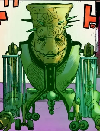 A sua cabeça é coberta por um capacete parecido com uma sacola, coberto de espetos e tendo o seu nome impresso nele, e olhos negros e encovados. A metade inferior de sua cabeça aparece como uma cabeça muscularide humanóide, várias marcas quadradas em torno de sua boca, e lábios negros esticados em um sorriso.