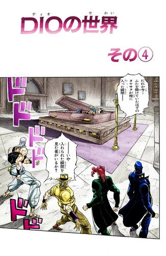 Confuso e assustado, o grupo pula da janela aberta da torre quando Jotaro sente a sede de sangue de DIO começar a se aproximar dele, utilizando seus Stands para pousar em segurança nos telhados inferiores da mansão.