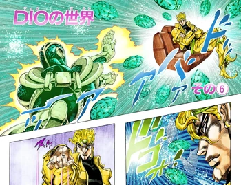 Hierophant Green lança um Emerald Splash em DIO. Com um dedo, DIO consegue desviar o ataque com facilidade. Hierophant Green então ataca com um Emerald Splash mais estreito, mas DIO o desvia novamente apenas com sua mão. DIO invoca The World, e soca o Stand de Kakyoin, fazendo-o voar para fora do alcance de The World. No caminhão, Joseph avisa Kakyoin para tomar cuidado, vendo-o sangrar muito. Kakyoin deduz que The World é um Stand de curto-alcance sem qualquer ataque de projéteis. Joseph percebe que o carro de DIO parou e pergunta-se o que está acontecendo. De repente, o corpo de Wilson Phillips bate no caminhão, fazendo o caminhão bater. DIO lenta e confiantemente aproxima-se do caminhão. Joseph e Kakyoin conseguem escapar, balançando nos telhados. Enquanto escapam, Kakyoin declara que pode ter encontrado uma forma de descobrir o segredo de The World.