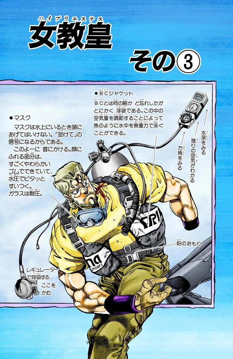 Enquanto o grupo veste os equipamentos de mergulho, Joseph ensina o básico de mergulhar. Ele explica que eles não podem entrar em pânico, e que eles precisam lentamente subir à superfície, explicando que se subirem muito rapidamente seus pulmões e vasos sanguíneos explodirão. Joseph então os diz que eles terão que usar sinais de mão porque não podem falar debaixo da água, o que faz Avdol lembrá-lo que eles podem falar com seus Stands. Polnareff afirma que conhece sinais de mão, e usa-os para dizer "Eu consigo ver sua roupa íntima". Quando Kakyoin decifra a mensagem, Polnareff celebra fazendo um aperto de mão viril com ele.