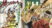 - Quando Avdol para a estátua de cair em cima dele, ele coloca suas mãos no peito da estátua no anime.