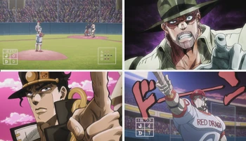 O time de Jotaro é o primeiro a bater. É revelado que Jotaro é completamente novo em videogames e perde seus primeiros dois batedores para se acostumar às mecânicas. Porém, na terceiro batida do terceiro batedor, Jotaro anuncia que dominou o jogo agora. Para a surpresa de D'Arby, o batedor de Jotaro faz um homerun bem-sucedido. Porém, D'Arby só está mais estimulado no desafio. Jotaro completa homeruns após homeruns e eventualmente consegue uma liderança de 4 pontos, e Joseph sente-se confortável o bastante para provocar D'Arby.
