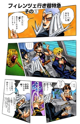 Fugo pergunta-se sobre a motivação de Trish, e se ela é ou não uma usuária de Stand. Mista, percebendo Fugo encarando Trish, começa a zombar dele. De repente, o carro em que eles estão para rapidamente, fazendo com que Fugo caia em Trish, o que Mista transforma numa cena cômica.